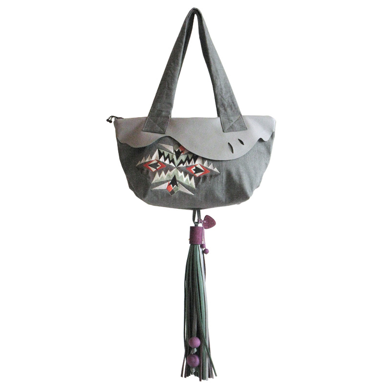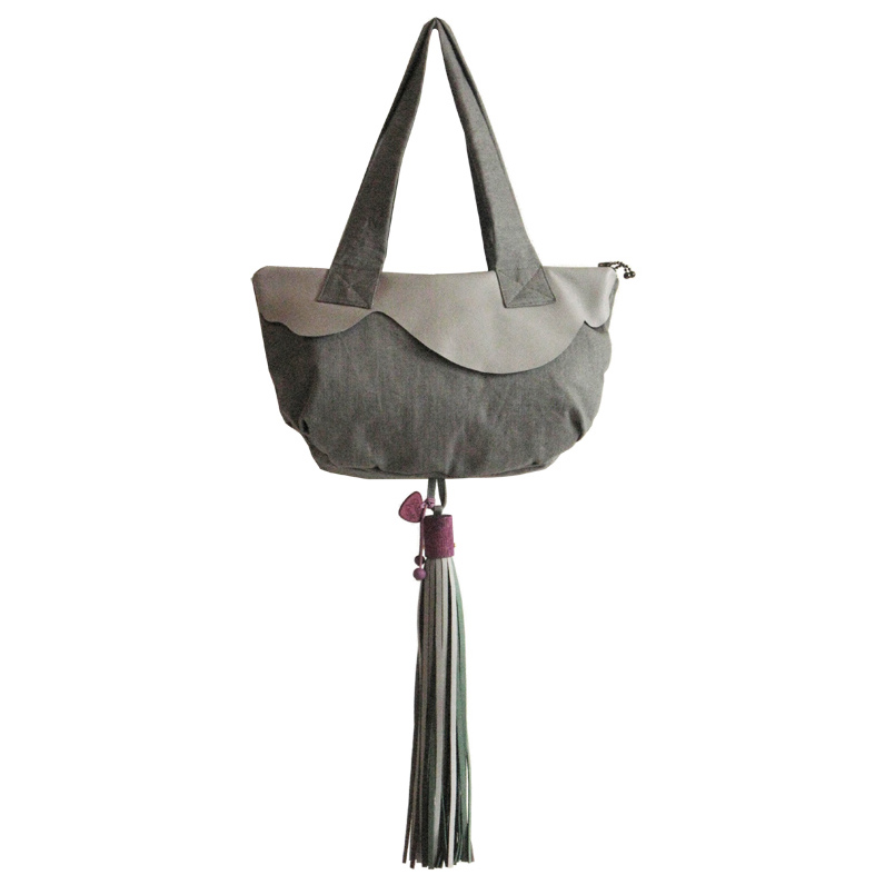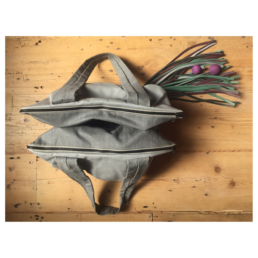Denim and vegan leather bag, with two main zippered compartments and a central useful slip pocket.