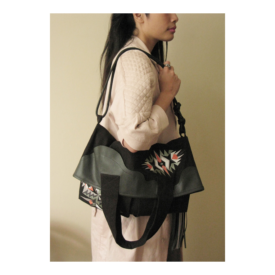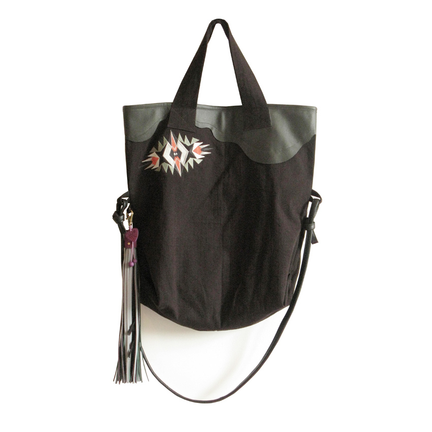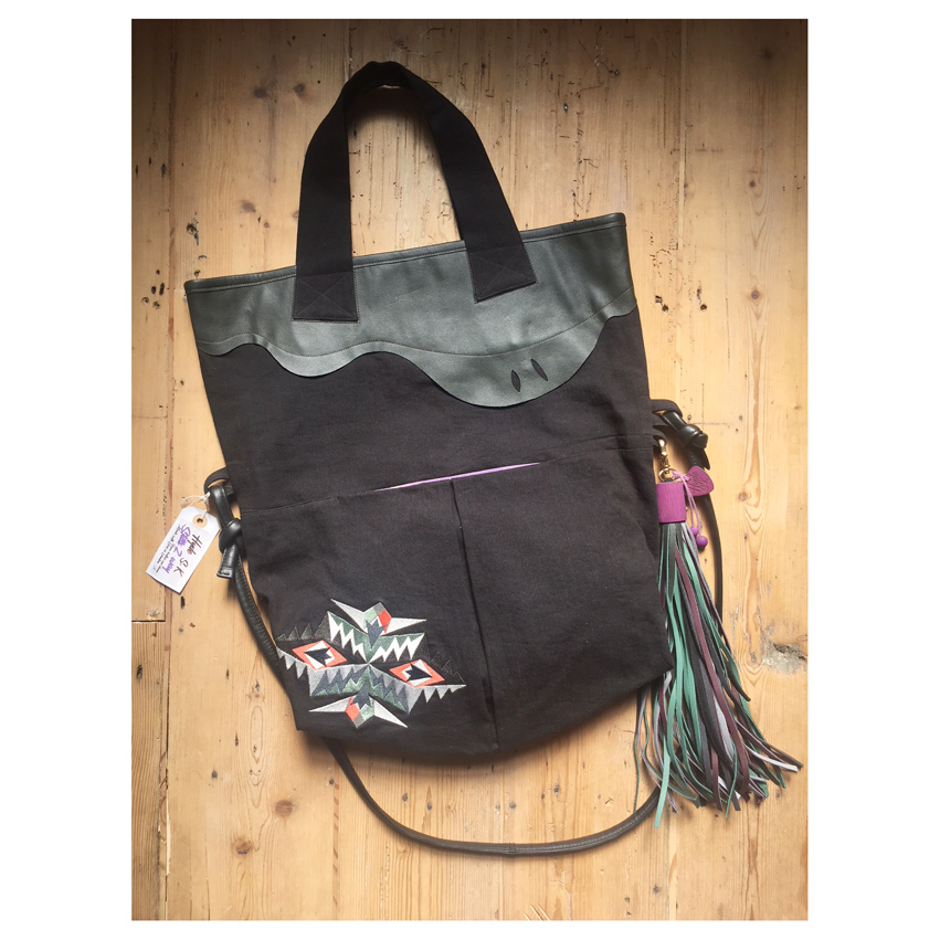 Oversized cotton denim and vegan leather two way bag. Can be used as a tote bag or a shoulder bag.