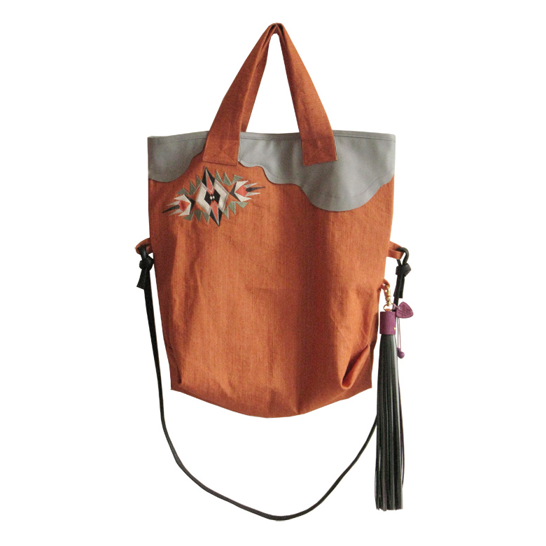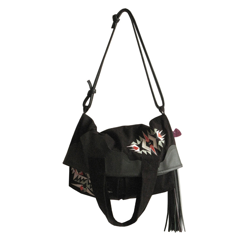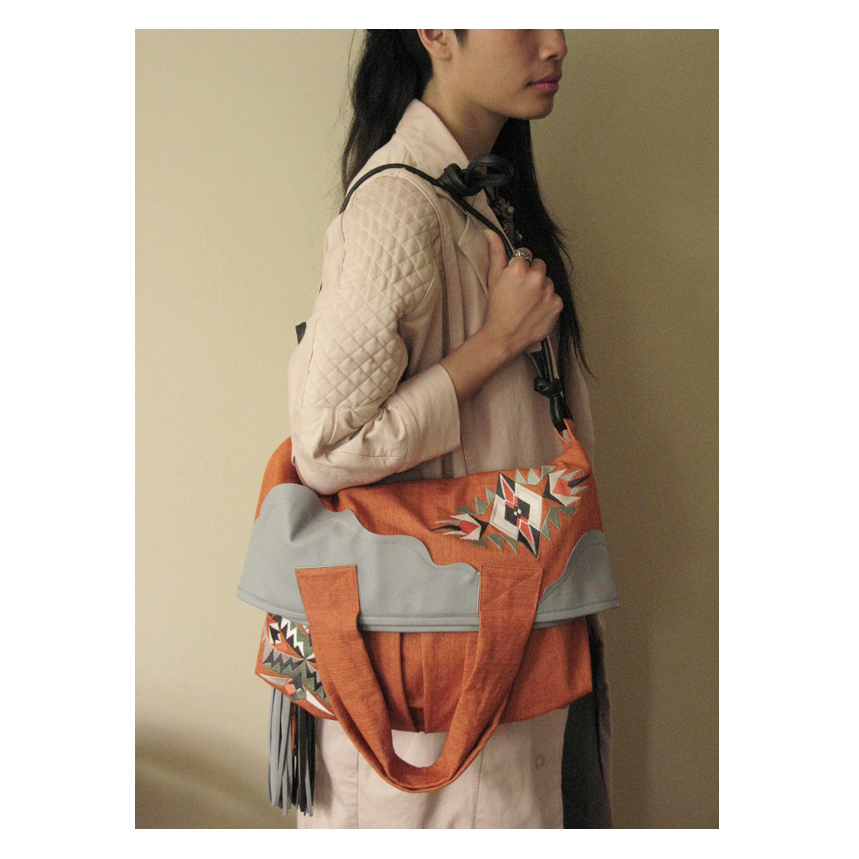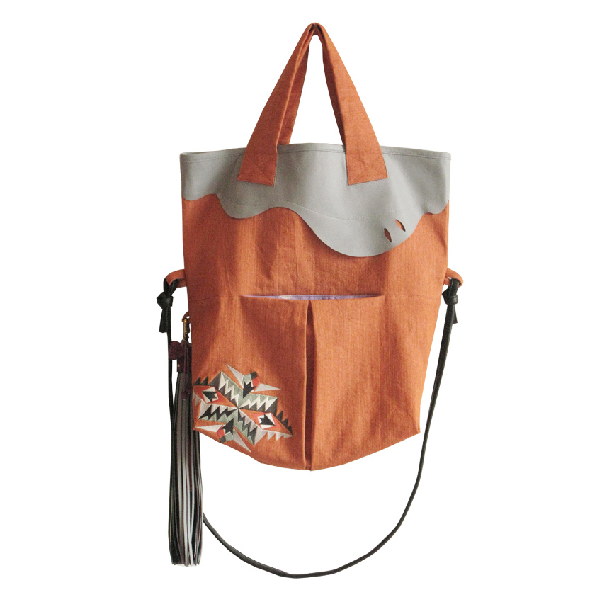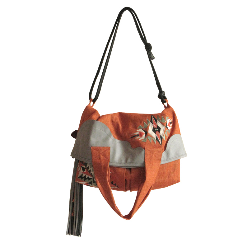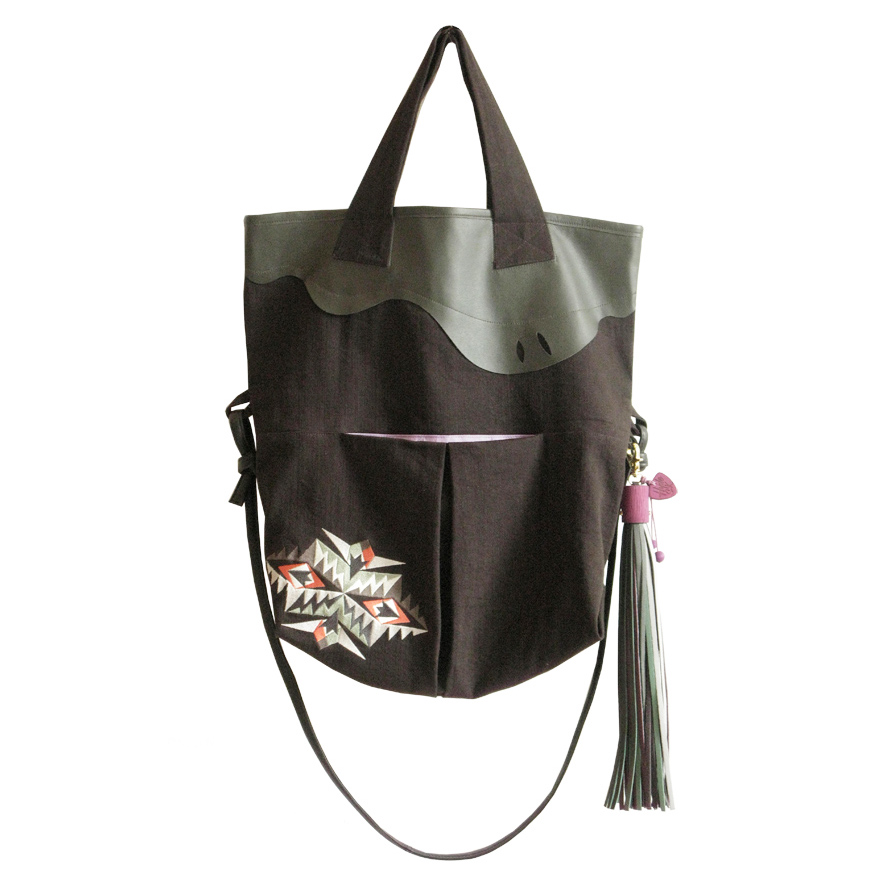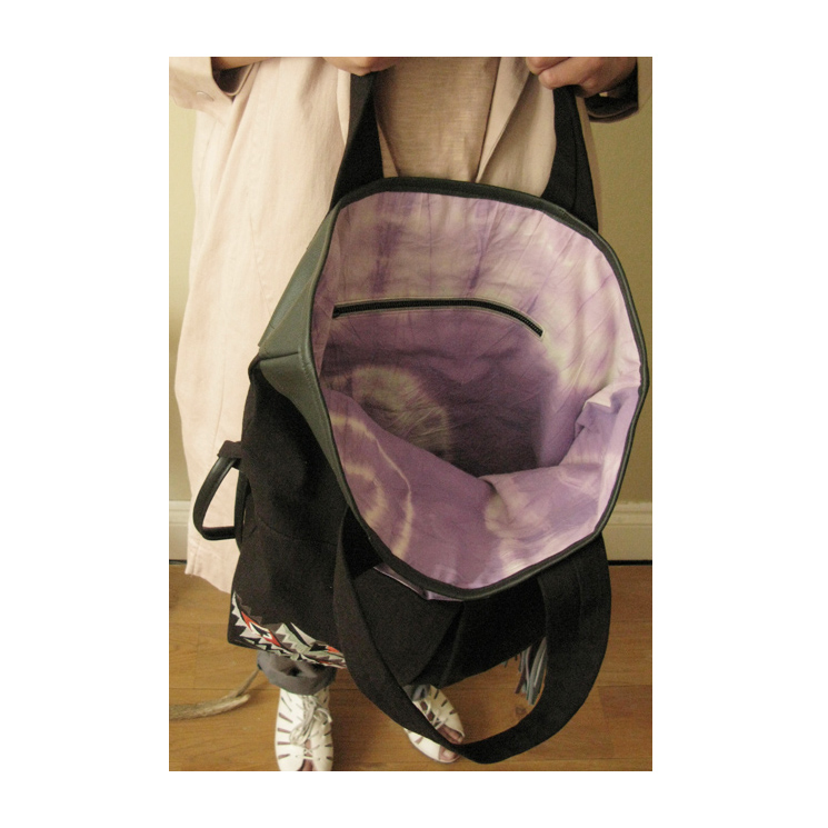 Bag has large front slip pocket. Both the bag and pocket are lined in a hand-tie dyed cotton.