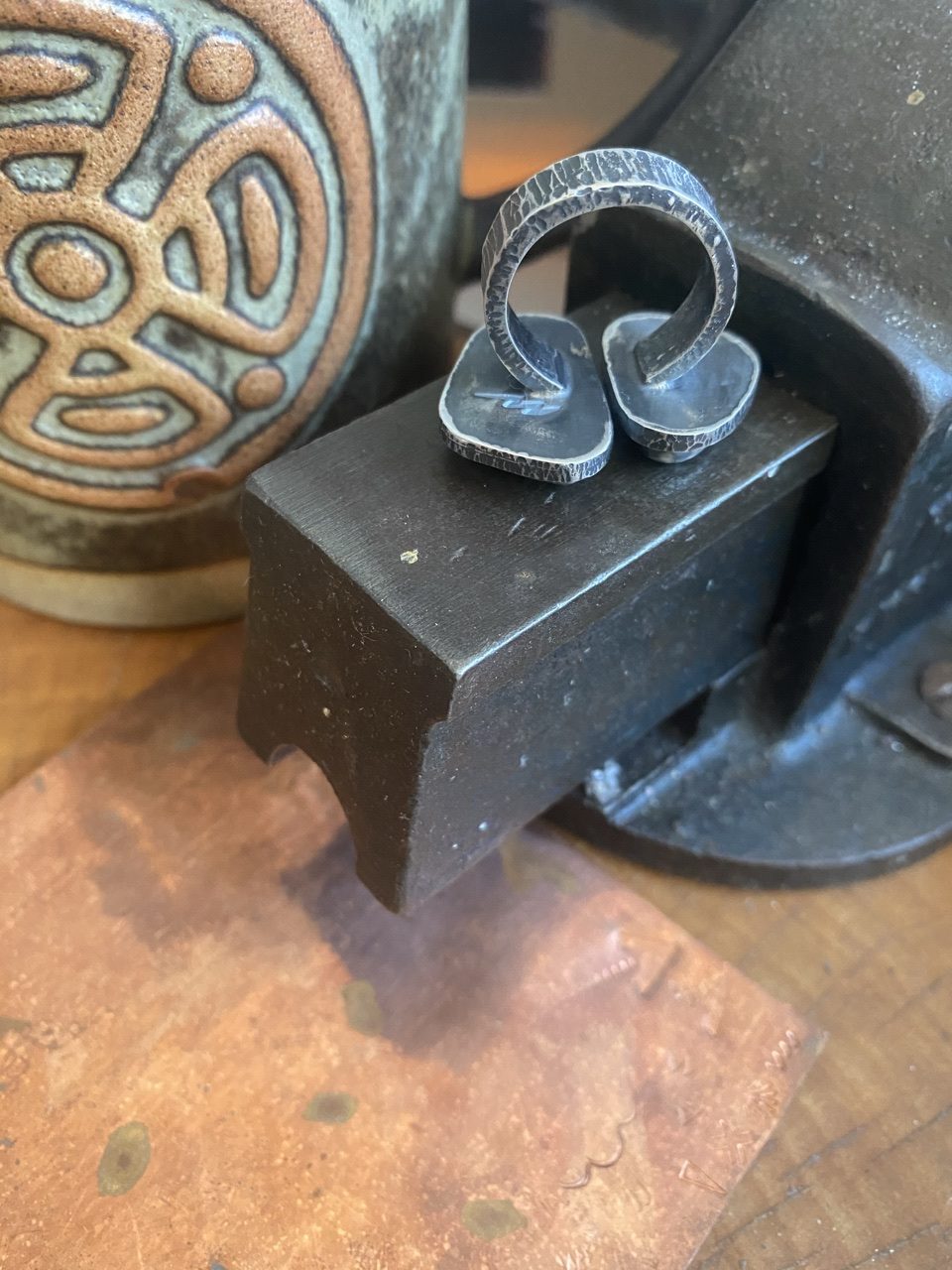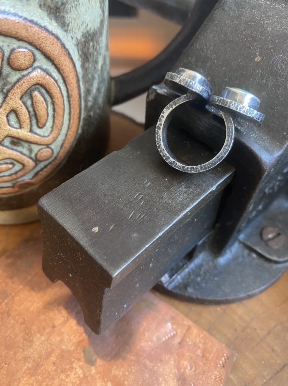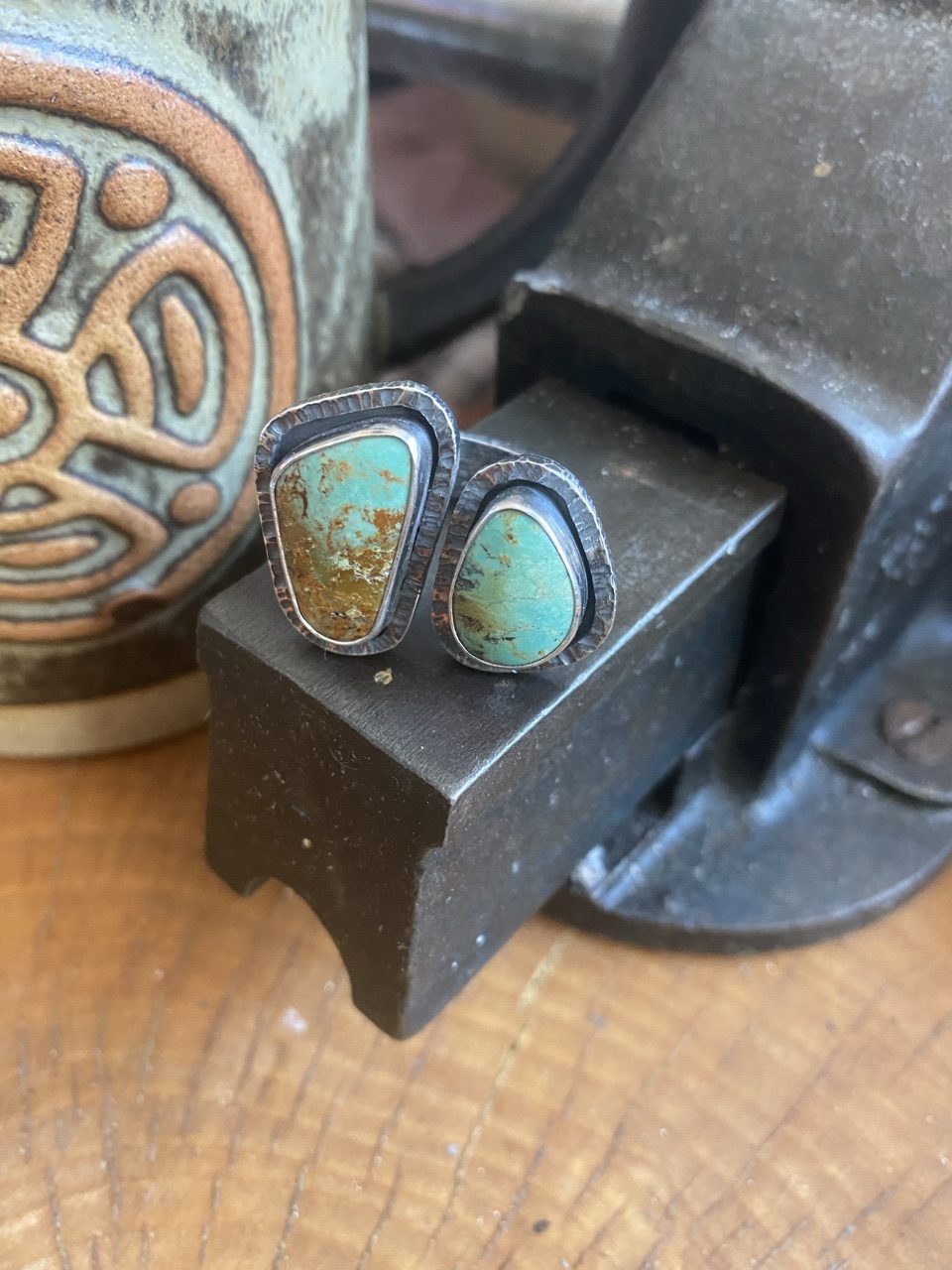 Chunky primitive torque style sterling silver and double Kingman turquoise ring.