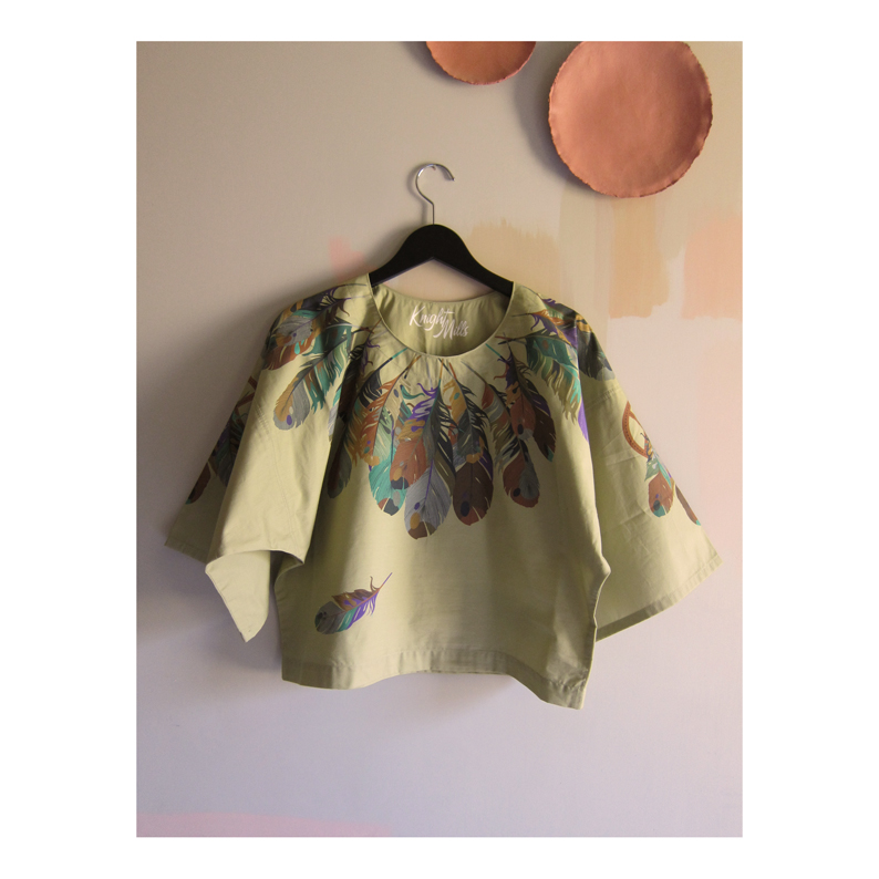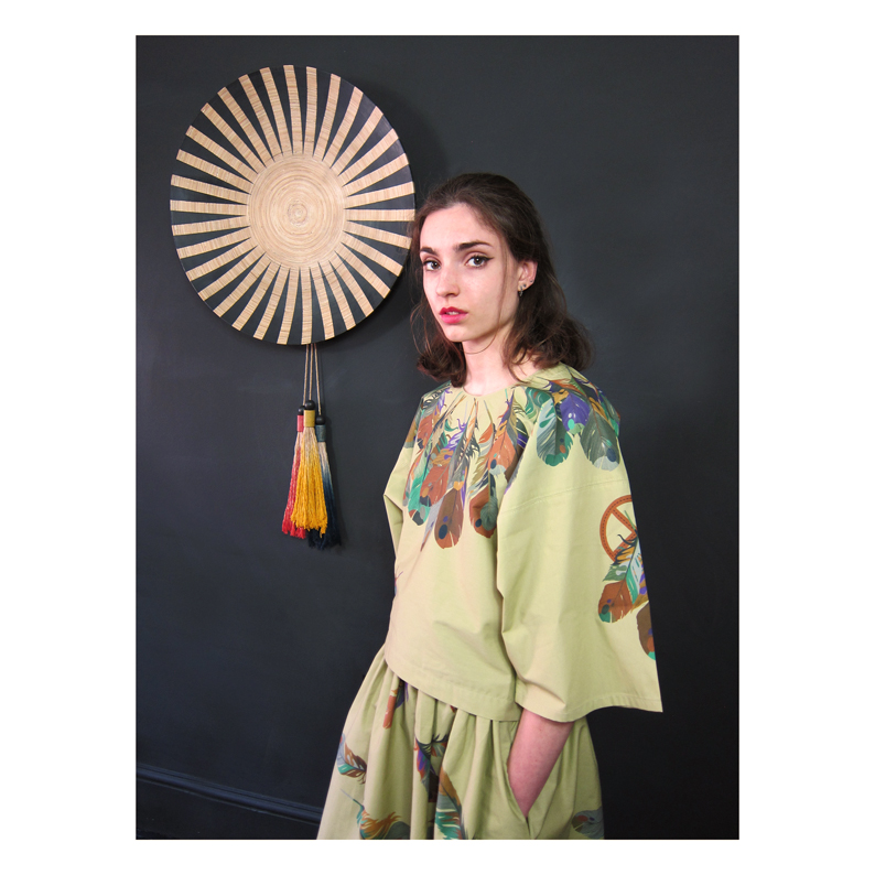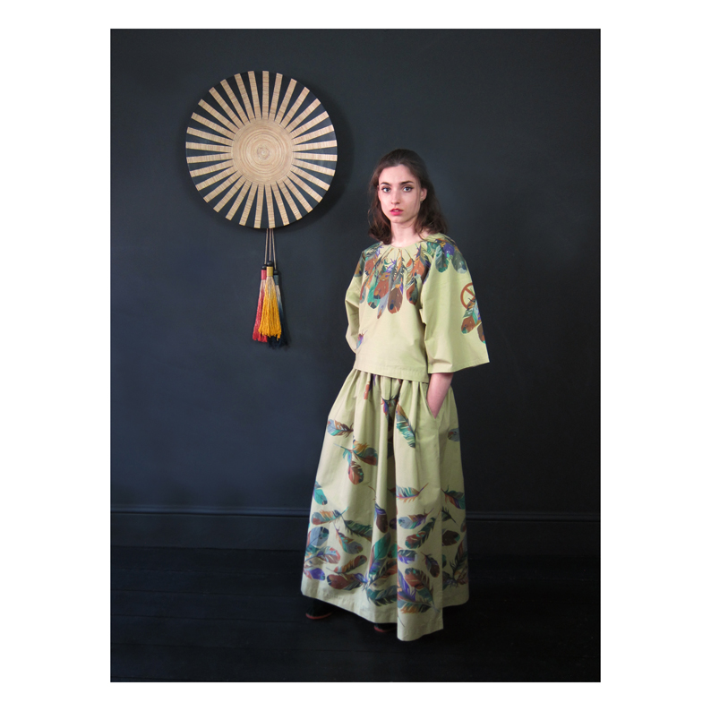 Falling Feathers’ print maxi + oversized box top, printed + made in England.