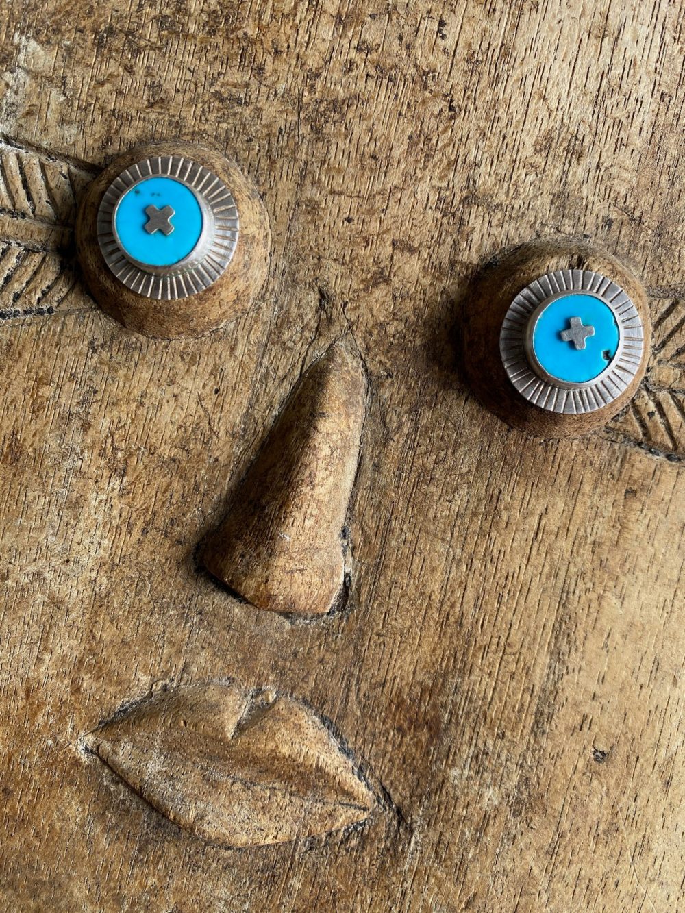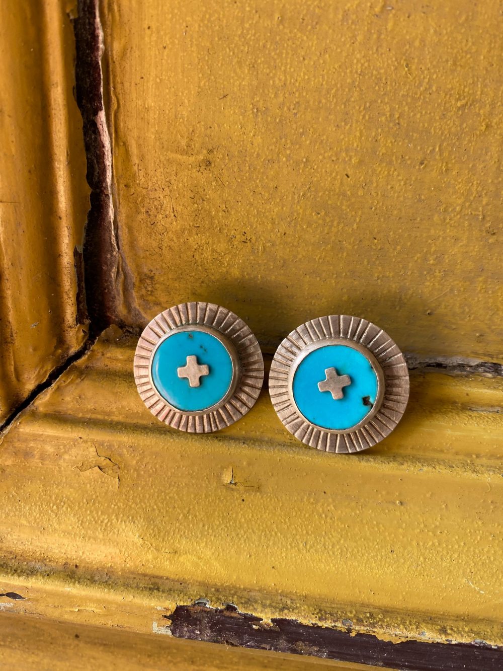 Beautiful discs of turquoise set in a primitive looking hammered and aged sterling silver setting.