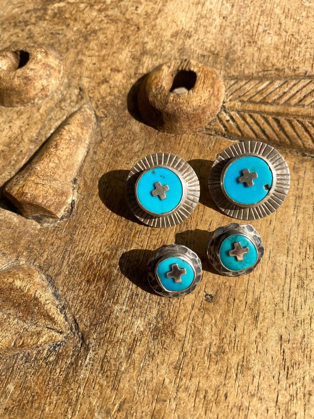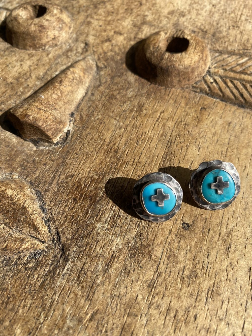 Beautiful organic discs of turquoise set in a primitive looking hammered and aged sterling silver setting.