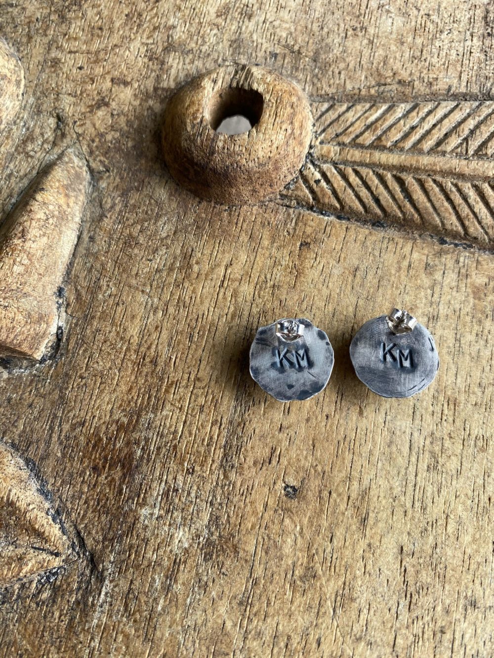 Earrings are stamped KM on reverse.