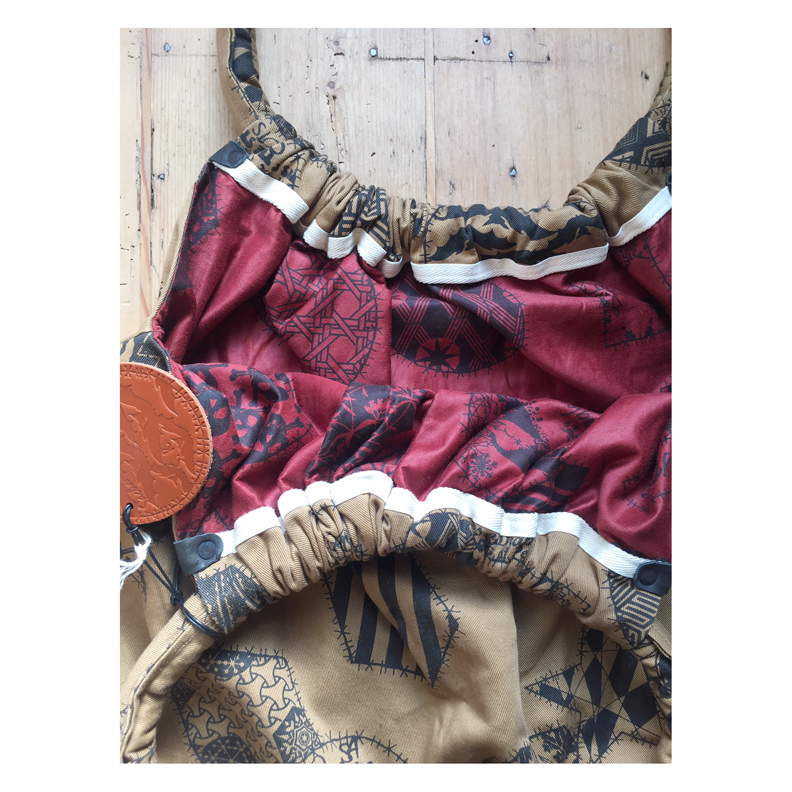 Large hand-printed tan coloured twill holdall. Lined in hand-printed cotton sateen..