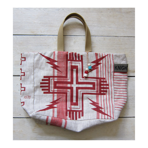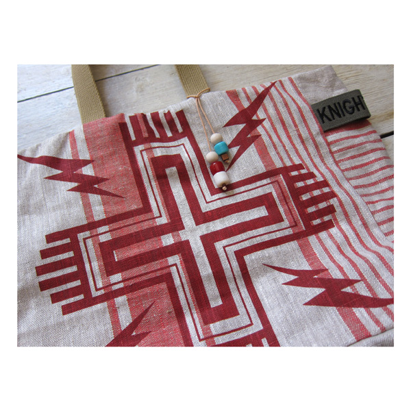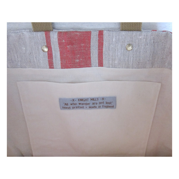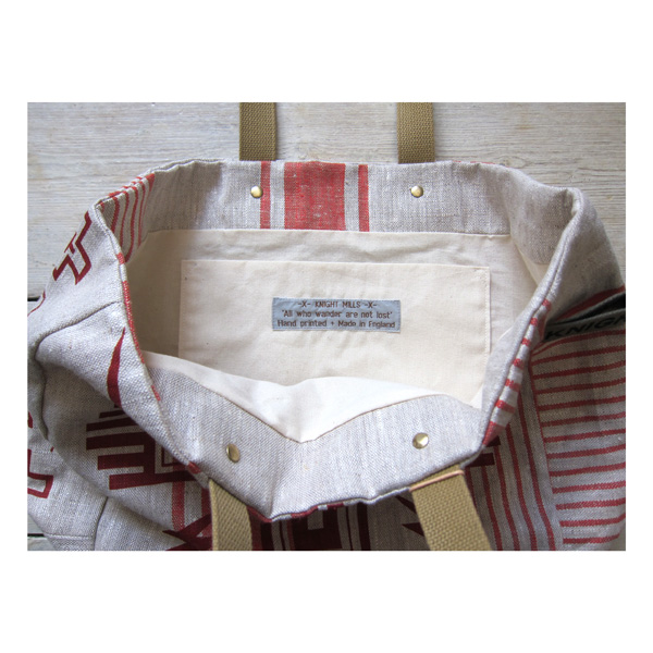The Cross n bolts’ gusseted tote is hand printed and made in England on hand loomed light weight European linen.
