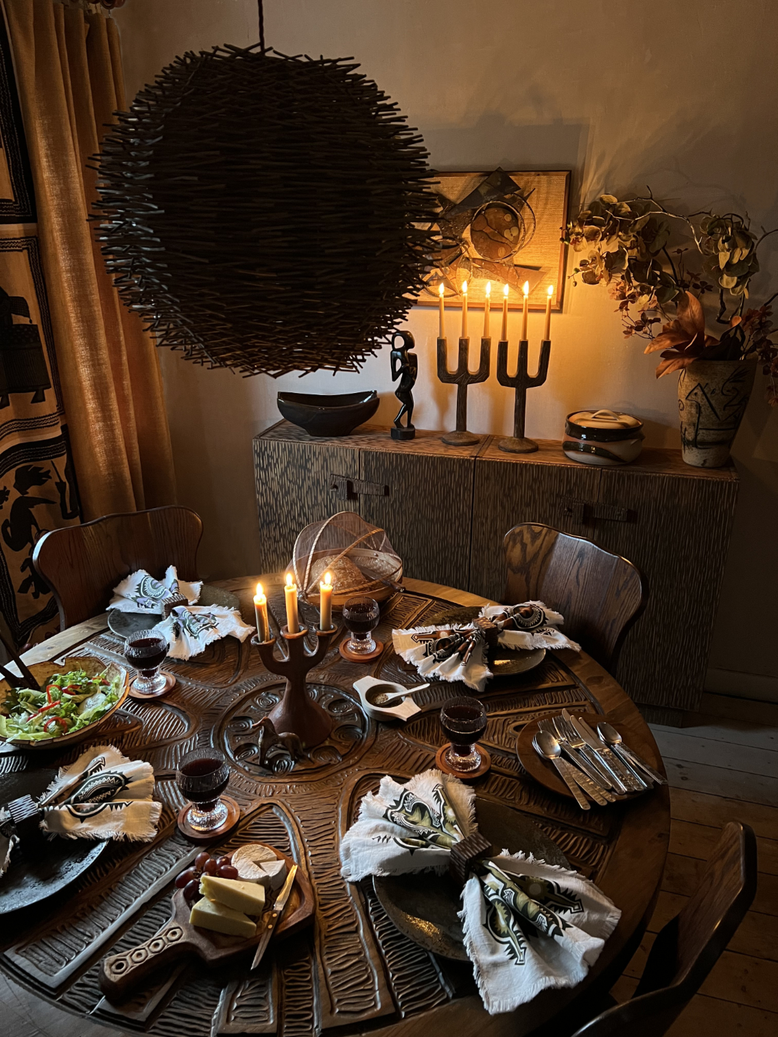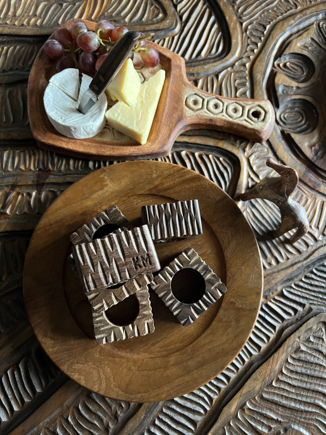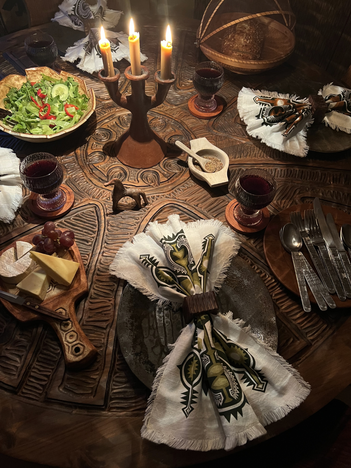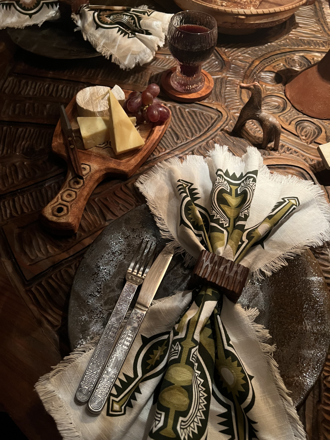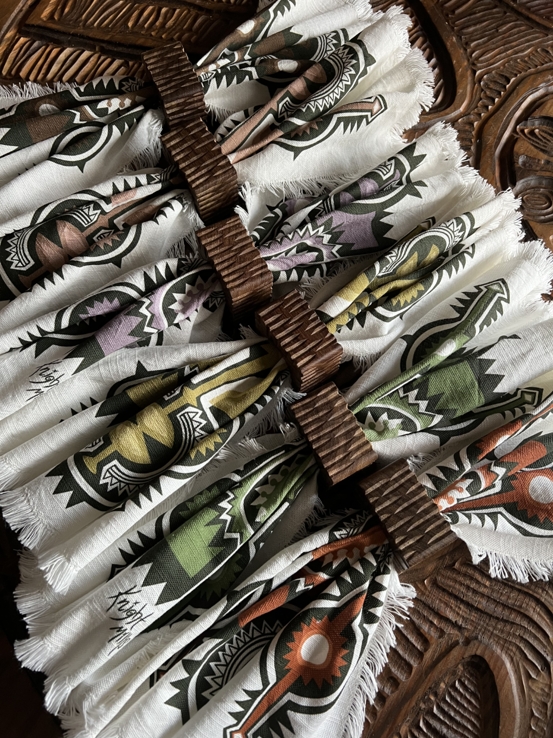 Set of 6 Napkins along with 6 hand~carved brutalist inspired solid + chunky Acacia wood napkin rings.