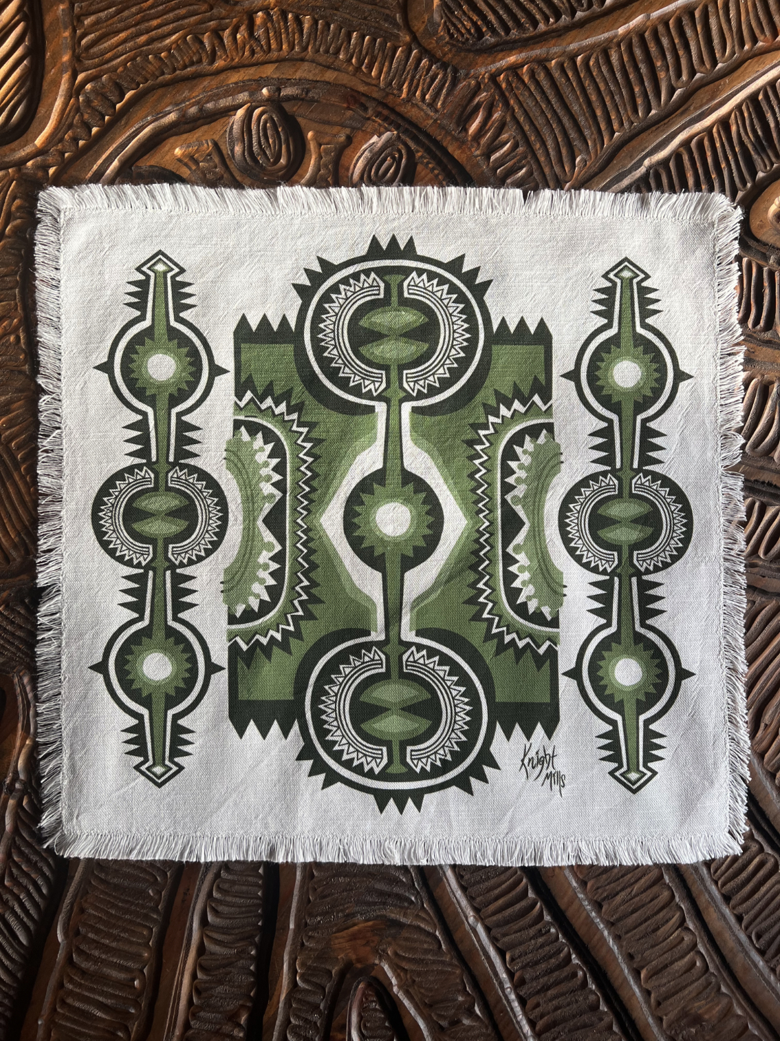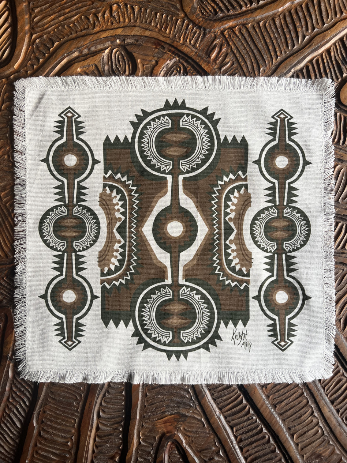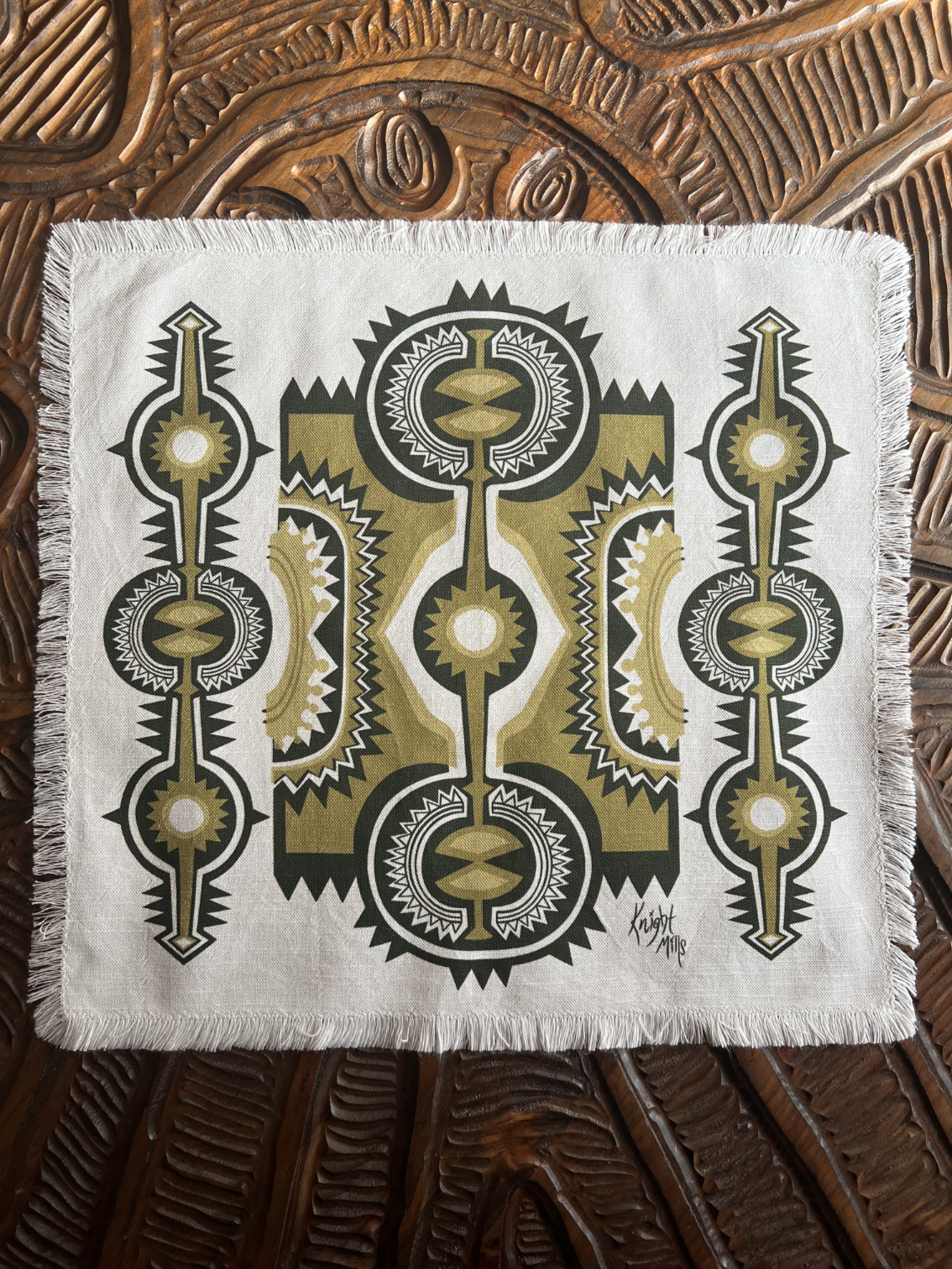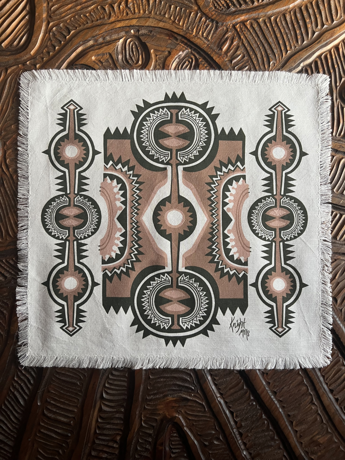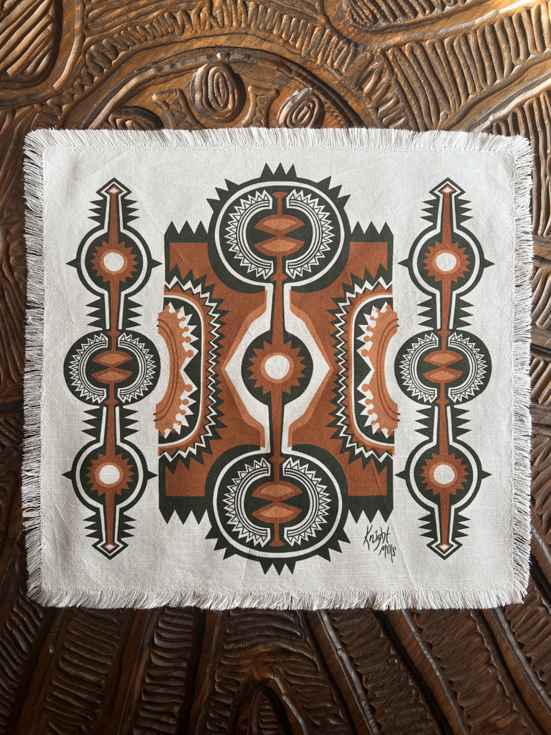 Mid~Century Modern primitive inspired design printed onto a luxury linen / cotton mix cloth.