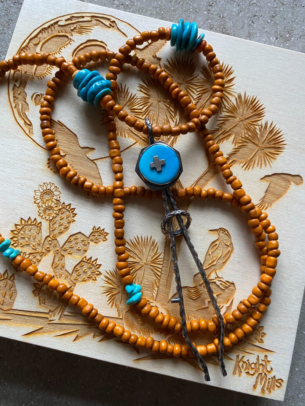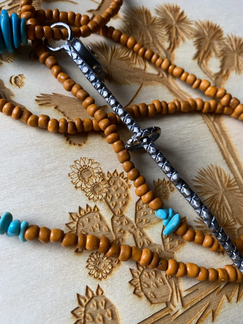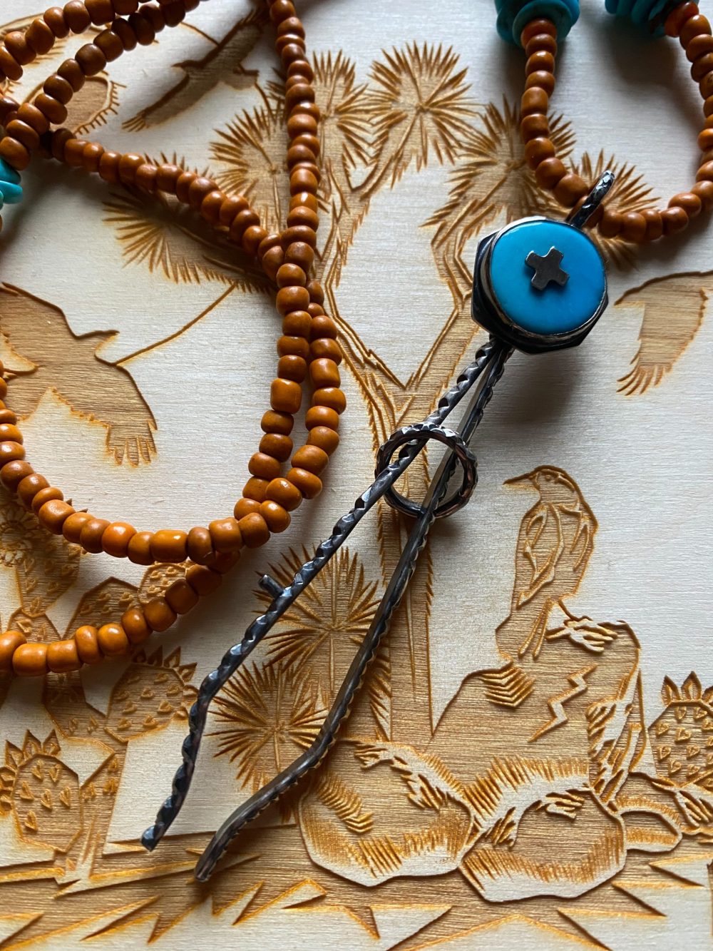 The clip is strung on a long strand of hand made glass pumpkin coloured beads with clusters of irregular Sleeping Beauty and Kingman turquoise nuggets beads.