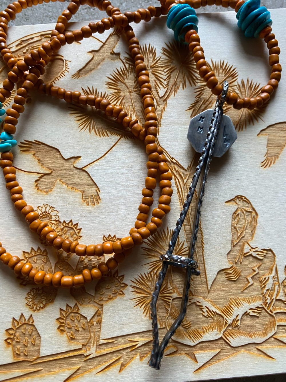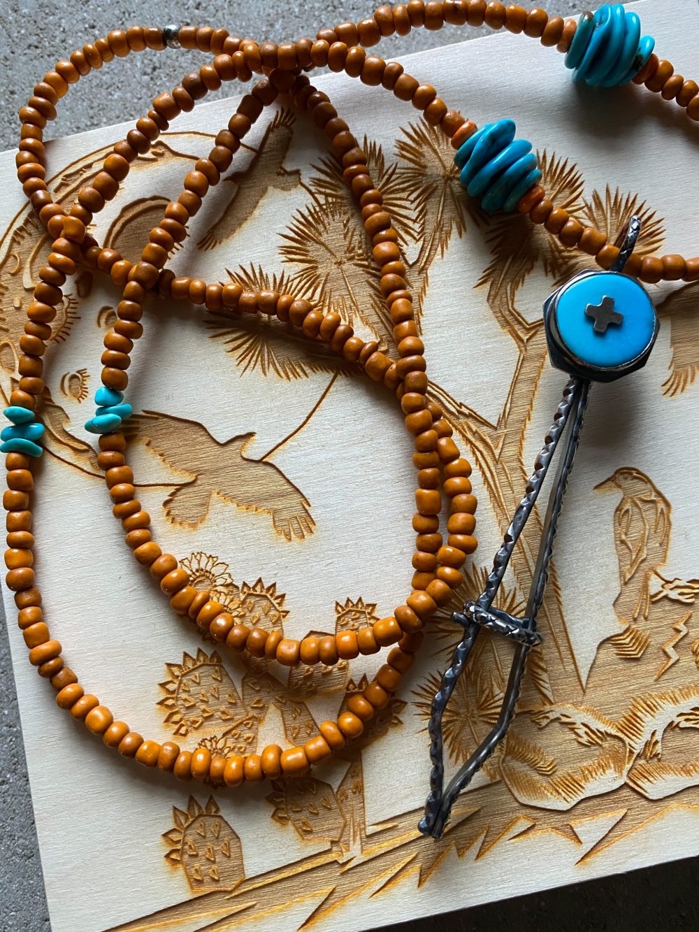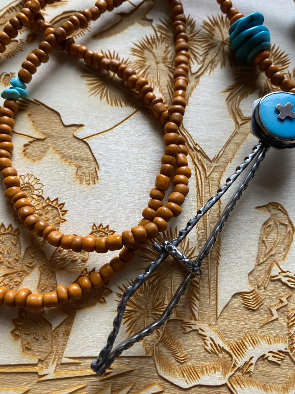 The clip is strung on a long strand of hand made glass pumpkin coloured beads with clusters of irregular Sleeping Beauty and Kingman turquoise nuggets beads.