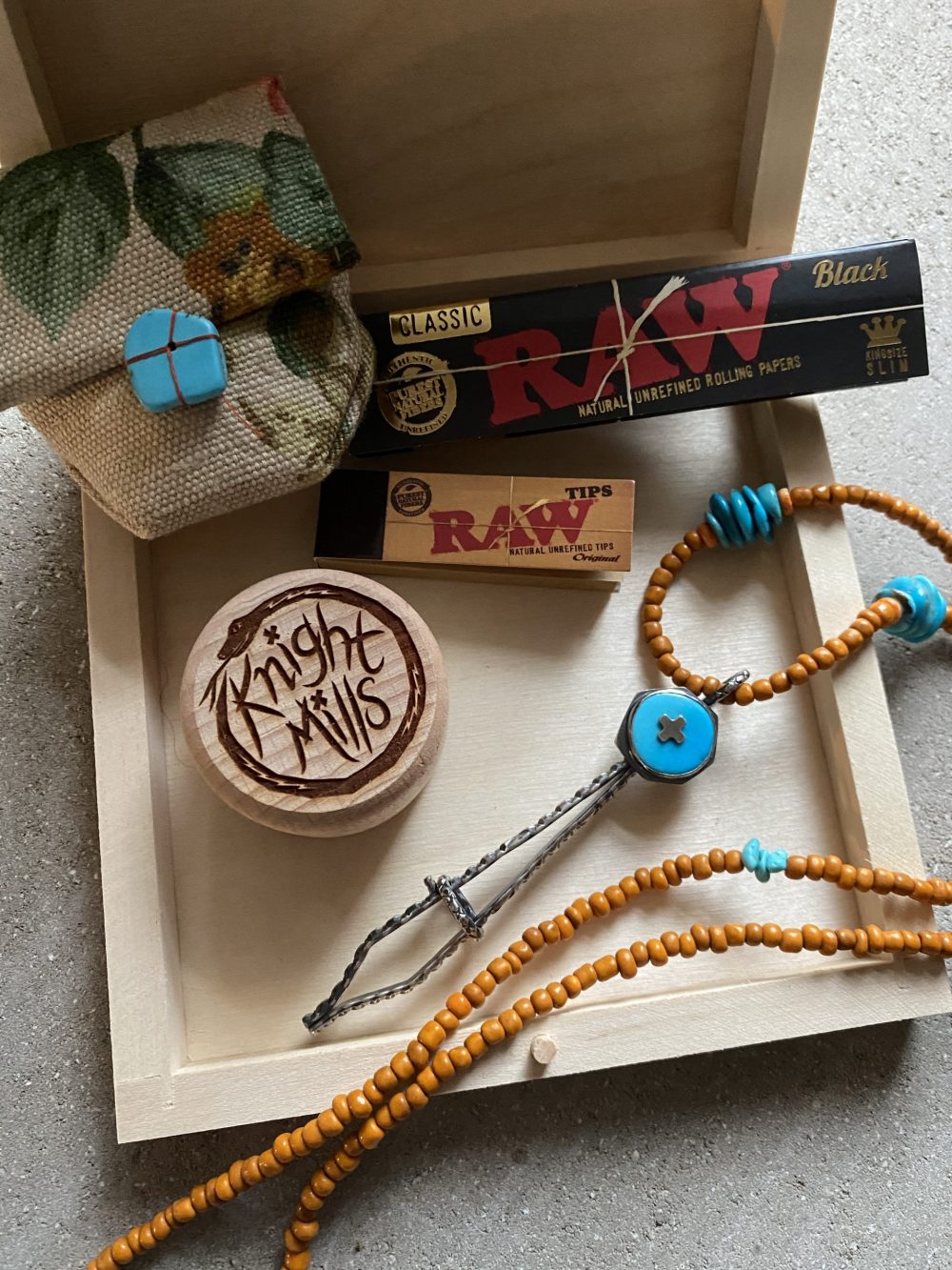 Item ships in an etched wood gift / stash 😉 box featuring an original Knight Mills design.