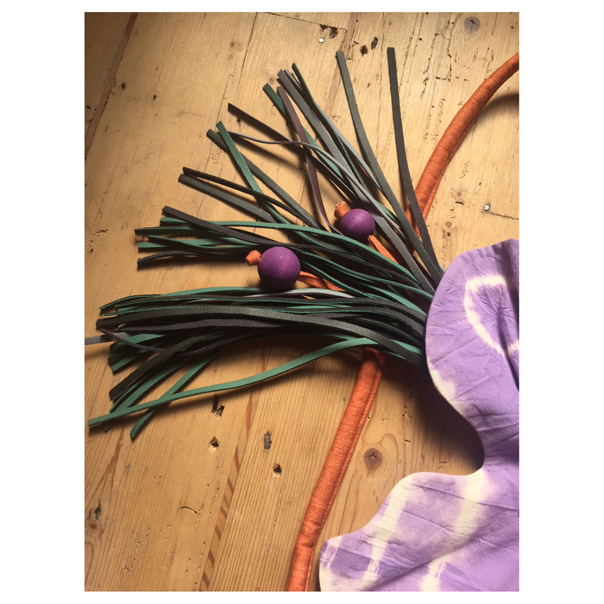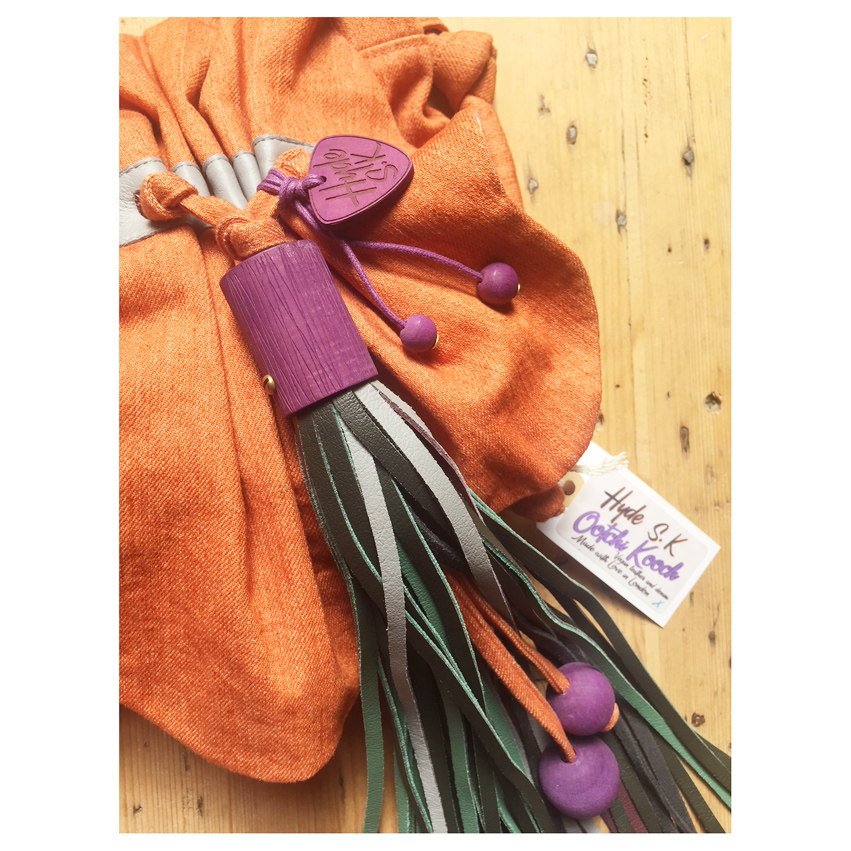 Hand-carved and hand-dyed wood and oversized vegan leather tassel detail.