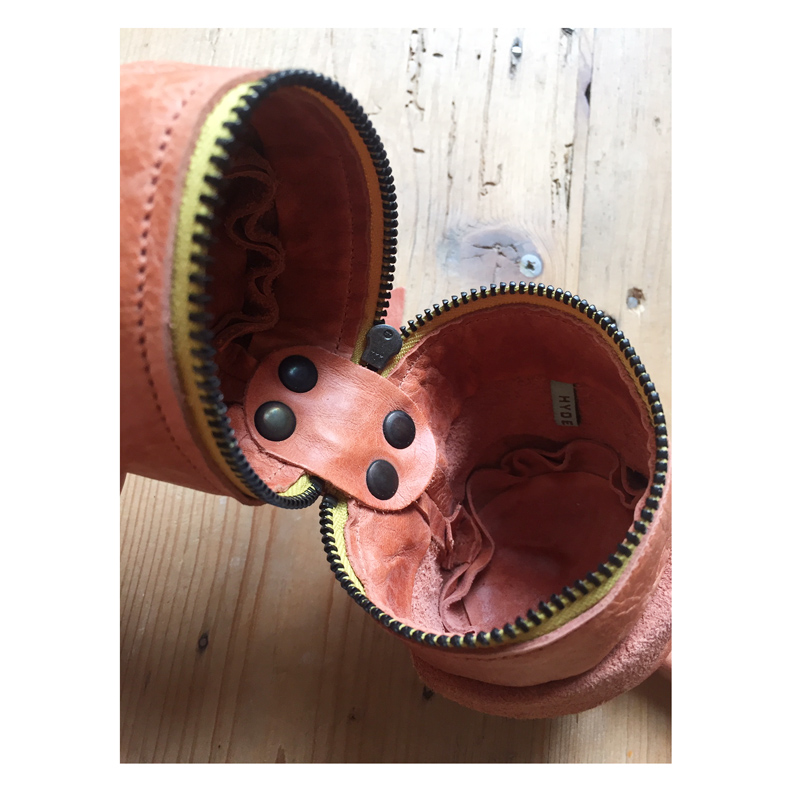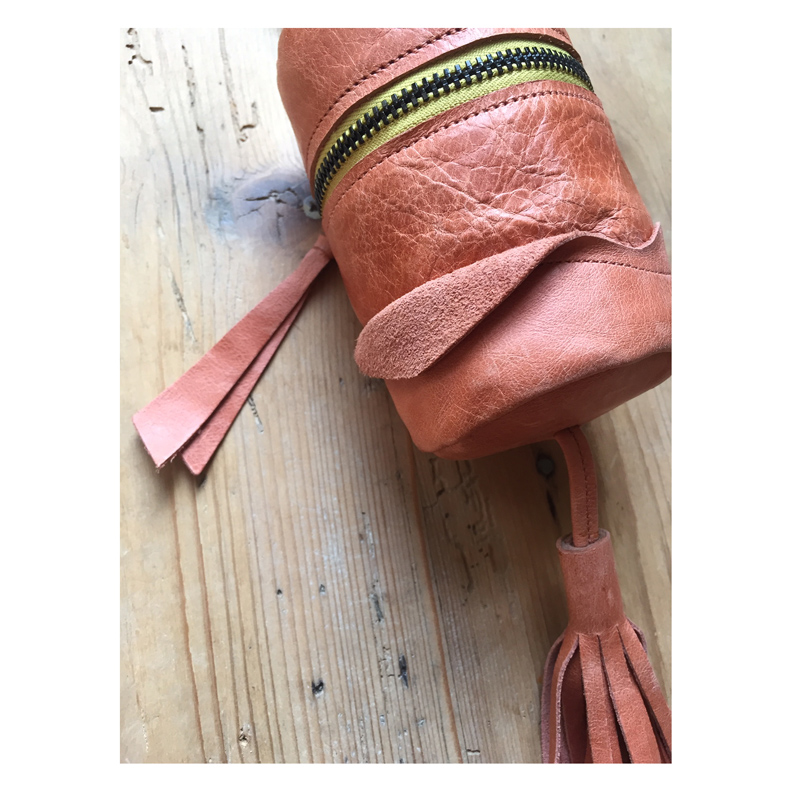 Neck pouch in a muted pumpkin orange leather with an acid pea green zipper, great for money, keys, lippy etc..