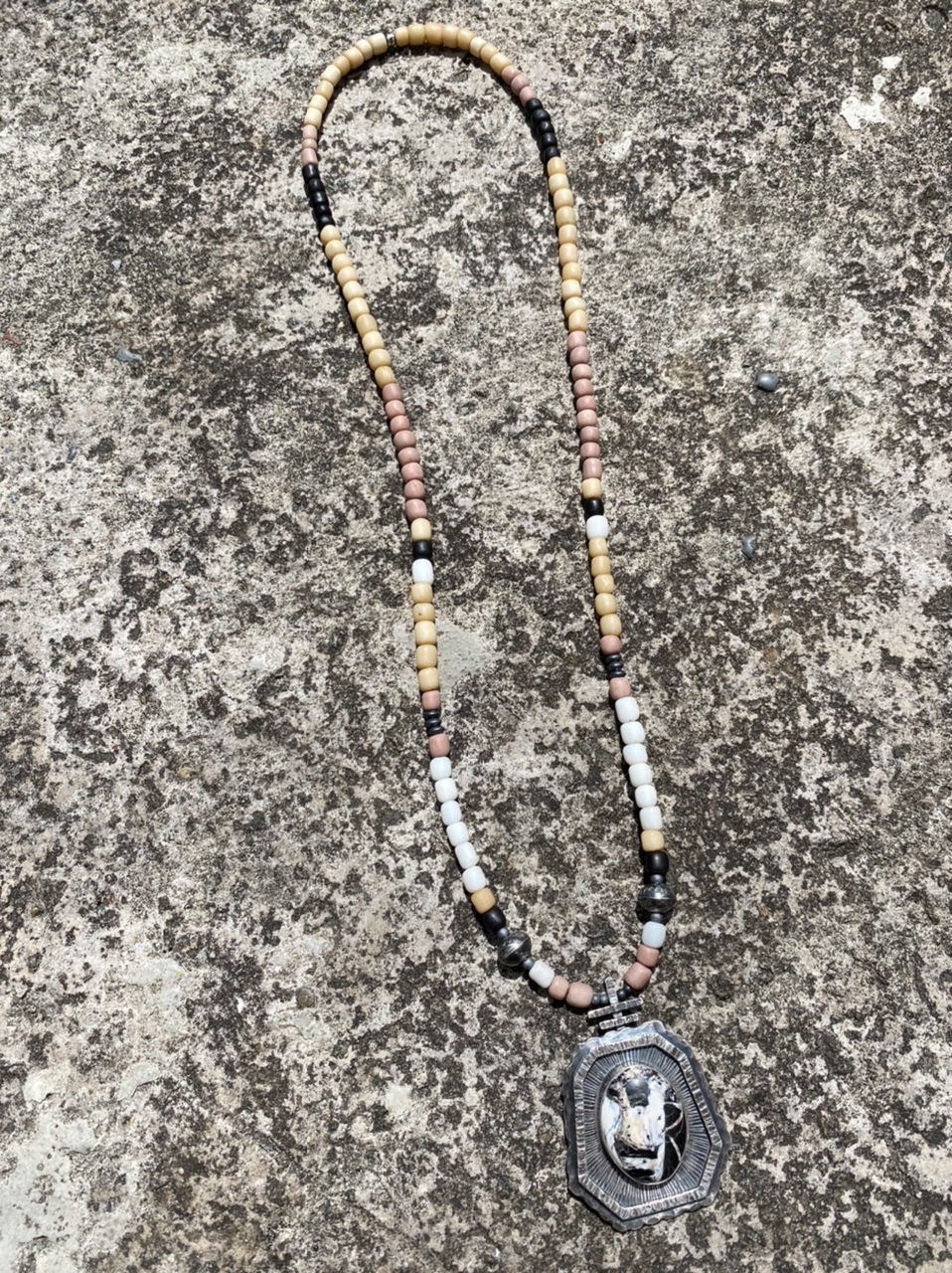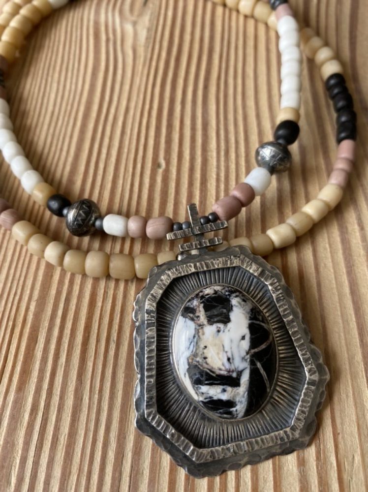 The White Buffalo stone sits in a primitive looking hand cut and hand stamped setting which has been hand-aged for that heirloom lived in look.
