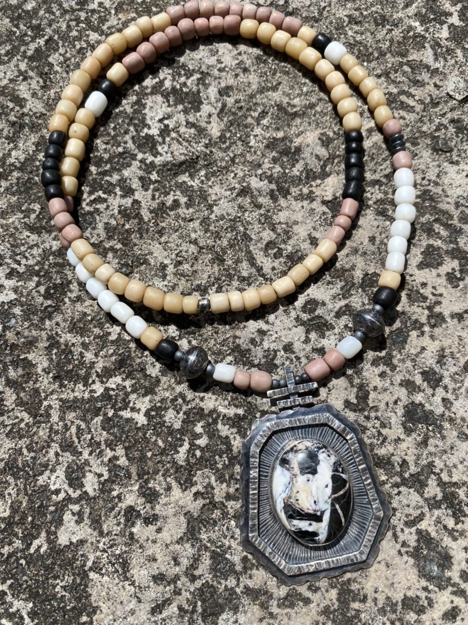Handmade sterling silver necklace featuring a rare and very beautiful genuine White Buffalo Turquoise stone which was mined in Nevada.